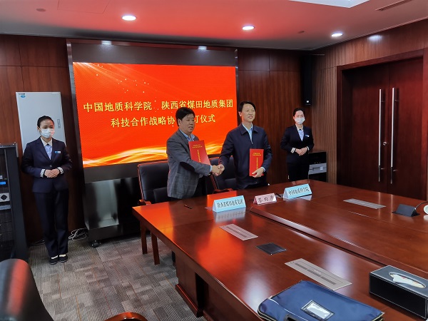 2020年10月30日,中国地质科学院与陕西省煤田地质集团在北京签署科技合作战略协议。集团党委书记、执行董事、总经理谢辉、副总经理姚建明,中国地质调查局党组成员、副局长,中国地质科学院常务副院长李金发,党组成员、总工程师,中国地质科学院党委书记、副院长严光生,中国地质科学院副院长吕庆田、总经济师张海波、研究生院副院长王秀华,自然资源部重点实验室(创新平台)管理办公室副主任、中国地质科学院平台管理处处长张辉旭,双方单位业务管理部门等20多人参加了协议签订仪式。集团党委书记、执行董事、总经理谢辉,中国地质调查局党组成员、副局长,中国地质科学院常务副院长李金发代表双方签署了战略合作协议并分别作了讲话,中国地质调查局党组成员、总工程师,中国地质科学院党委书记、副院长严光生主持了协议签署仪式。谢辉在讲话中指出,与中国地质科学院签署《科技合作战略协议》是陕西省煤田地质集团产业及科技发展过程中的一件大事,标志着集团在高端科技平台建设、重点科研项目协同攻关、人才培养及高层次科技交流等领域将获得中国地质科学院的权威指导和宝贵支持,集团要运用最新理论成果武装地勘队伍,为转型升级赋能,朝着地质科学研究的新高度迈进。谢辉介绍了煤田地质集团发展历程和近年来的发展情况,表示将以此次合作共建“西北能源矿产研究中心”为契机,在页岩气、地热能、煤炭绿色勘查与清洁利用、矿山环境治理和土地修复等领域,依托中国地质科学院雄厚的研究基础,进行深度合作,打造央企合作促进地勘行业高质量发展的典范。