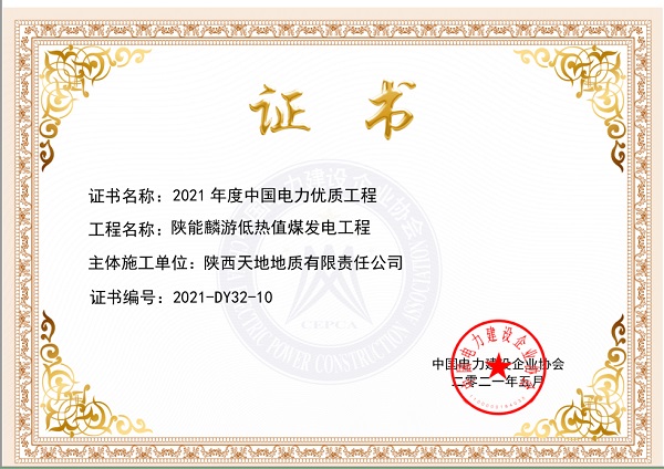 天地公司陕能麟游低热值煤发电工程荣获“2021年度中国电力优质工程奖”