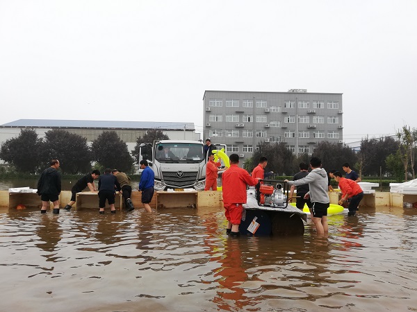克服困难,确保职工生活和甲方发货正常进行。在抗洪抢险关键时刻,由于厂外200米以内的道路积水较深,一般车辆无法进入,厂区全面断电,无法生产和发货,两家公司干部职工发扬“只要思想不滑坡、办法总比困难多”的精神,利用机械公司大卡车进行摆渡,解决职工的吃饭和交通问题。利用人工和自制简易冲锋舟(汽油桶加木板)对工地进行发货,保证甲方工地的进度和需求。对延迟发货的甲方进行充分解释,机械公司甲方两批次人员在实地查看公司灾情后,对公司现状和延迟供货表示理解和支持。从29日晨至10月1日,公司进行人员及物资转运达200余次。大地公司也完成20余箱铝箔的发货任务。