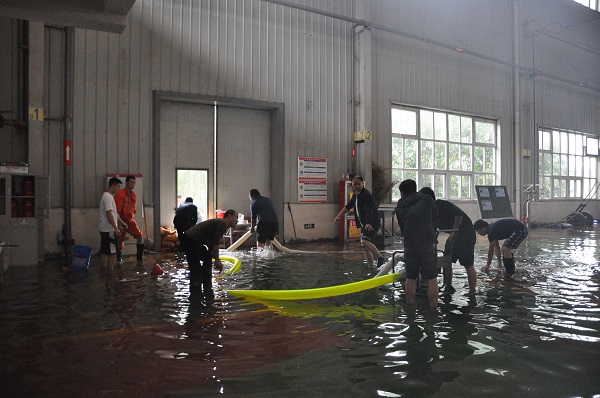 水位持续上涨,抢险刻不容缓。29日下午16时随着厂内水位不断上升,厂区车间开始进水,夜间实时监测水位以1cm/h速度持续上涨,至30日晨平均水位达到峰值。在全面断电的情况下,全体人员连续36小时作业,不断对车间大门口沙袋进行加固,对漏水点进行密封,对能抬高的设备物资进行垫高处理,组织职工进行人力排水。9月30日8时,车间水位已达到27cm,为减少车间内灾情的进一步扩大,机械公司自购两台4寸78m/h排量的汽油机自吸水泵对车间内污水进行抽排,尽量保持车间内水位不再上升;大地公司员工自发带来一台小型发电机和一台抽水泵用于救灾。与水位抢时间,以人力抗天灾,奋力开展抗涝抢险救灾工作。